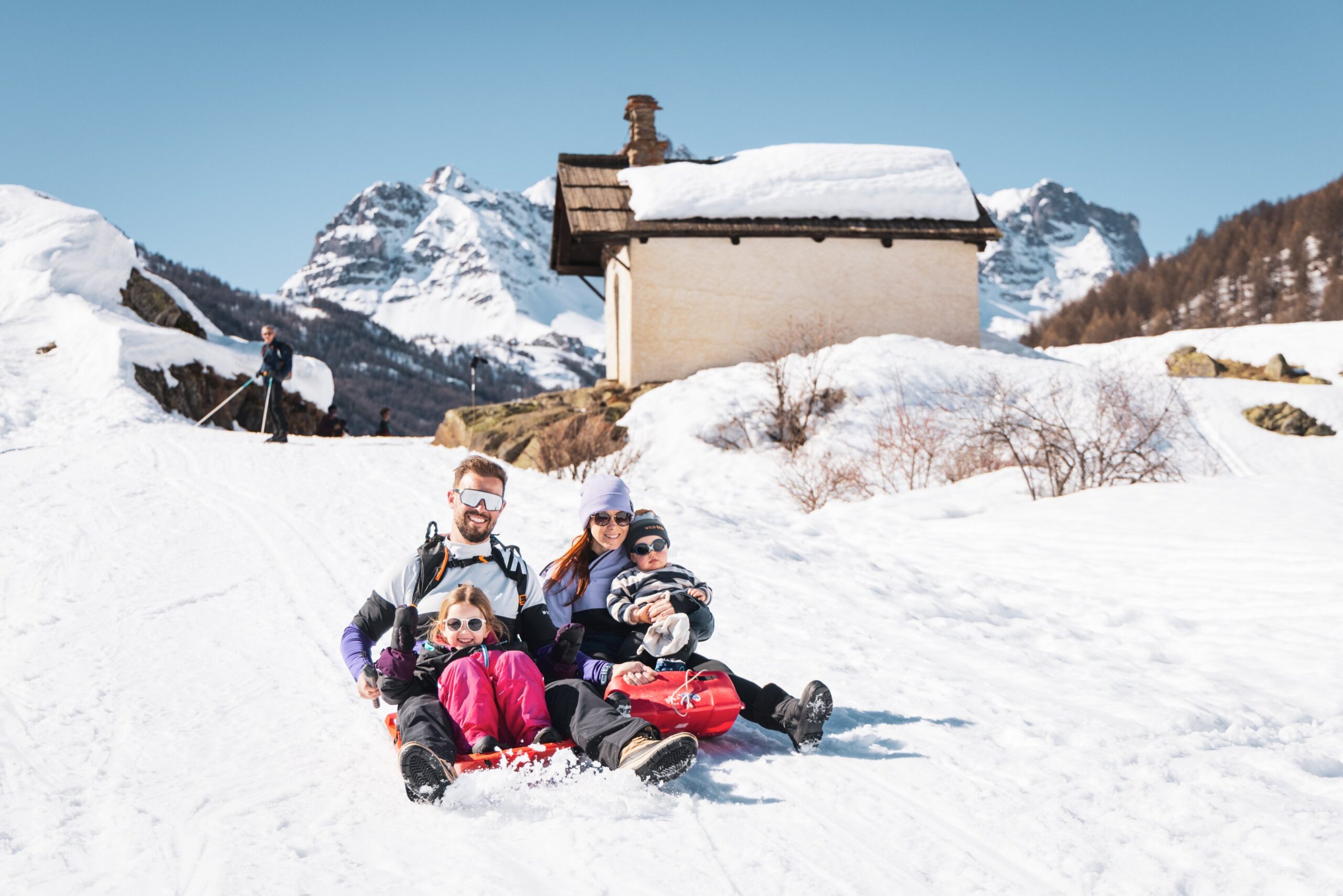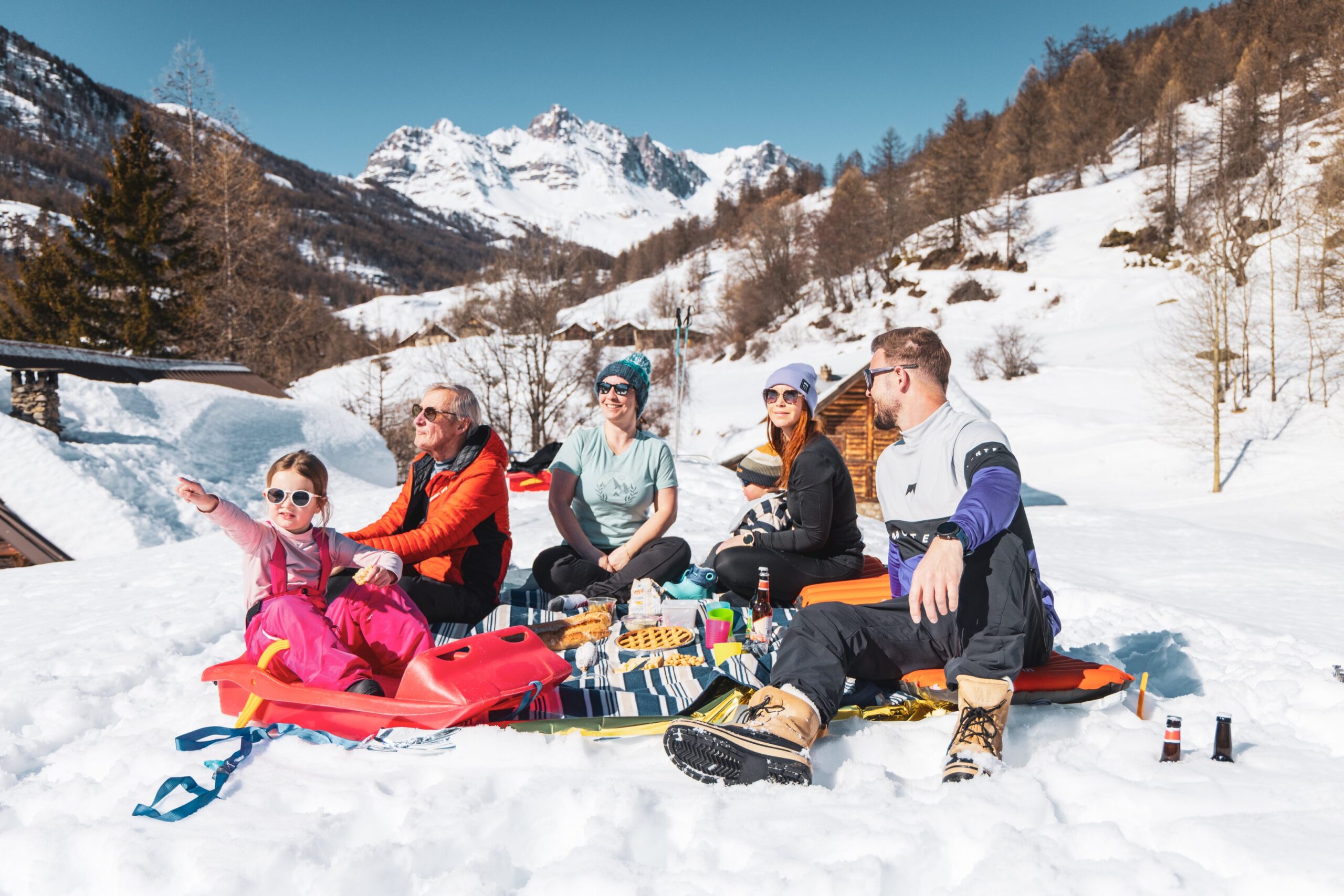 À notre arrivée, la vallée est recouverte d’un épais manteau blanc. Impossible de résister : les enfants se jettent dans la neige pendant que les parents retrouvent leurs souvenirs d’enfance.